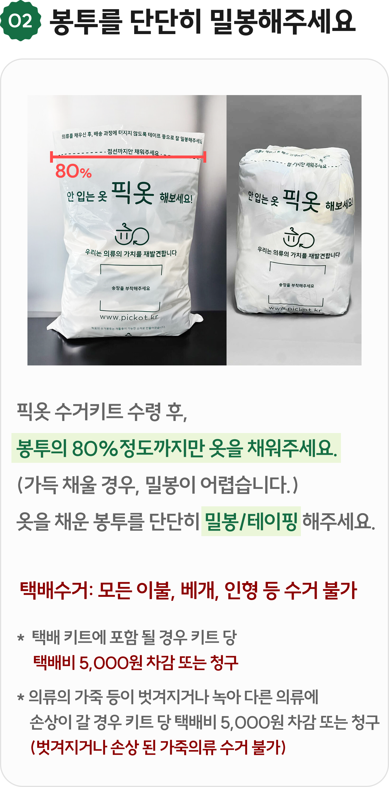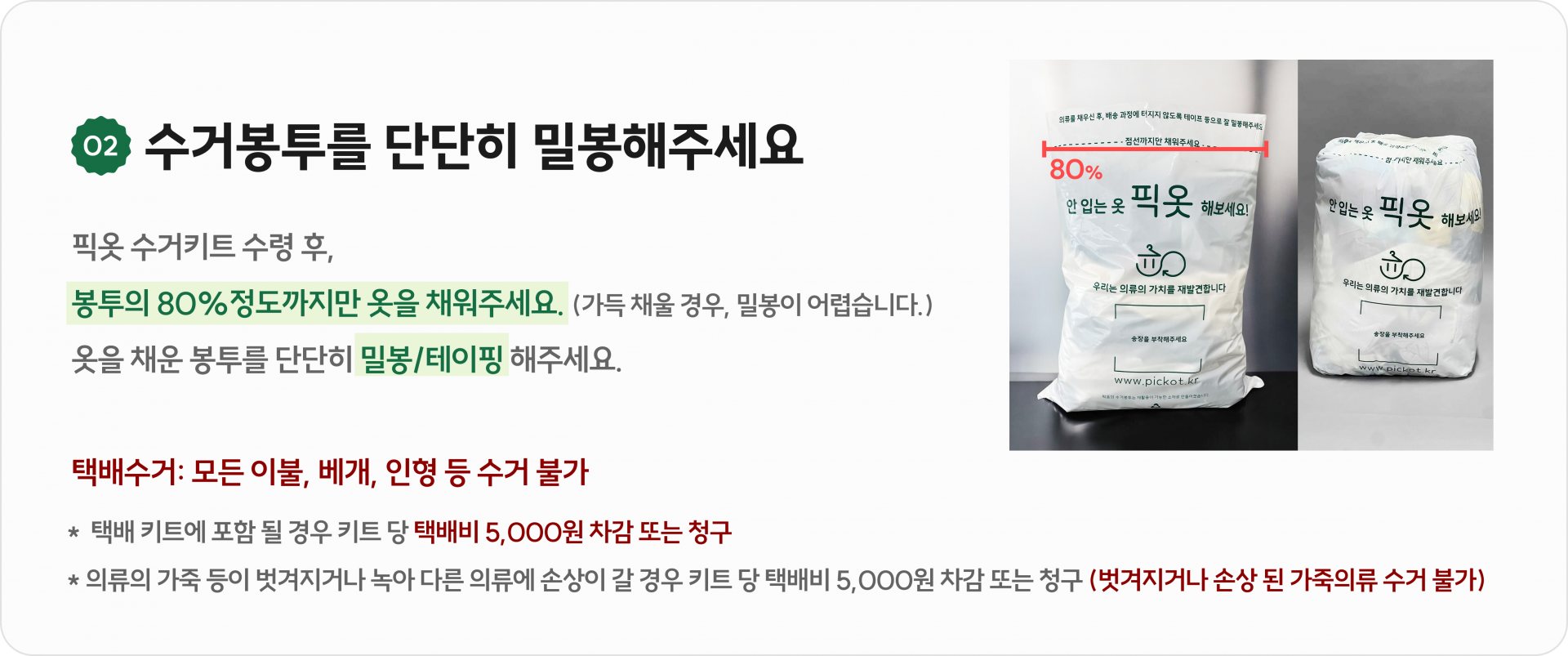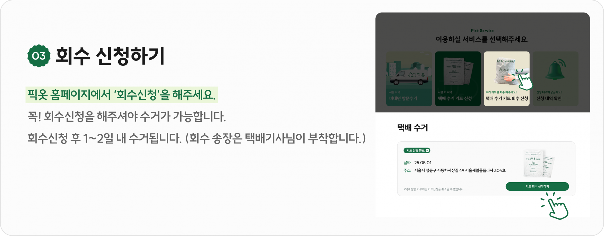 * 택배사 및 픽옷은 택배 반송 시 수거키트 파손 및 분실 사고에 대한 보상 책임을 지지 않는점 이용에 참고 부탁드립니다.