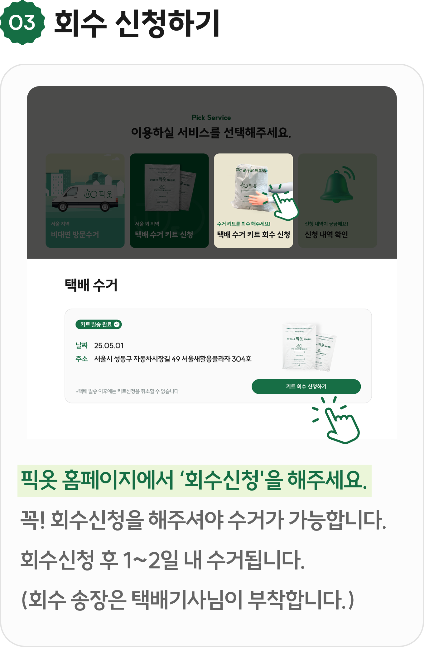 아래의 수거키트 이용방법에 따라 신청부터 회수까지 픽옷해보세요!